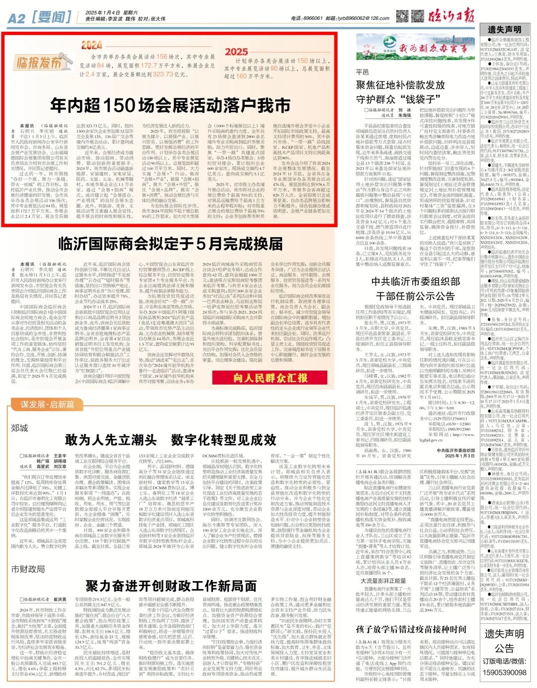 过去的一年,我市围绕“办好一个展、聚力一条链、带火一座城”的工作目标,依托临沂产业优势,推动全市会展经济健康向好发展。全市共举办各类会展活动156场次,其中专业展览活动84场,展览面积172.7万平方米,参展企业总计2.4万家,展会交易额达到323.73亿元。同时,组织1500余家次企业参加第32届华交会及第135、136届广交会等境内外展会活动,累计意向成交额约8亿美元。